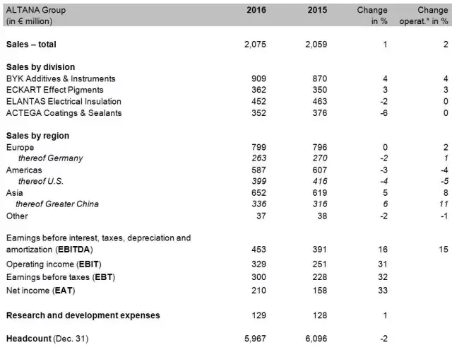在2016年,阿尔塔纳集团毕克助剂和仪器部的销售额同比增长4%,达到9.09亿欧元;爱卡特殊效果颜料部的销售额为3.62亿欧元,同比增长3%;艾伦塔斯电气绝缘材料部的销售额同比下降2%,达4.52亿欧元;ACTEGA涂料和密封材料部的销售额同比下降6%,为3.52亿欧元。