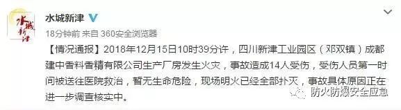 2018年12月15日10时39分许,四川新津工业园区(邓双镇)成都建中香料香精有限公司生产厂房发生火灾,事故造成14人受伤,受伤人员第一时间被送往医院救治,暂无生命危险,现场明火已经全部扑灭,事故具体原因正在进一步调查核实中。