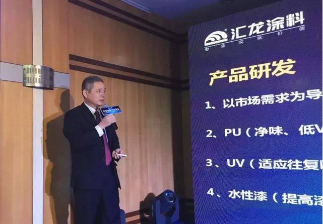 技术与产品是企业的核心竞争力,也是企业发展的核心要素。会上,汇龙涂料家具漆事业部副总经理蔡意高作了《稳中求进,产品为王——2019家具漆研发及产品分享》,向与会嘉宾详细介绍了汇龙PU漆、UV漆、LED UV漆、水性漆等代表性的环保产品的特点及优势。