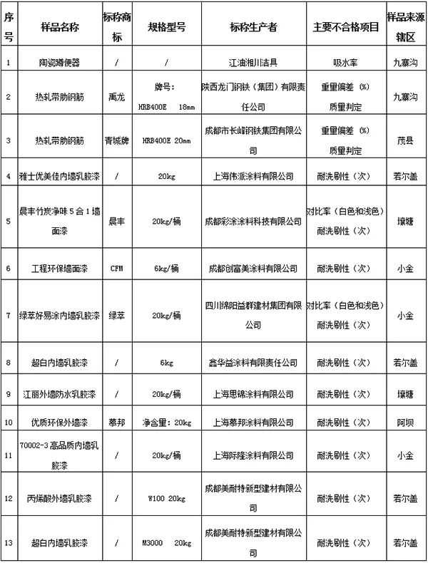 为切实加强流通领域商品质量监管,有效保护广大消费者合法权益,2018年,阿坝州工商局依法组织在全州流通领域开展了服装鞋帽、家居用品、个人生活用品、儿童用品、家用电器、珠宝玉石、五金交电、建材及装饰装修材料、消防产品、燃油、农资、交通工具共12类21种商品质量抽查检验。抽检结果显示,共有13批次产品抽检不合格,其中成都彩涂涂料科技有限公司、上海伟派涂料有限公司、成都创富美涂料有限公司、四川绵阳益群建材集团有限公司、鑫华益涂料有限责任公司、上海思锦涂料有限公司、上海慕邦涂料有限公司、上海际隆涂料有限公司、成都美耐特新型建材有限公司等9家公司生产的产品均被检出不合格。