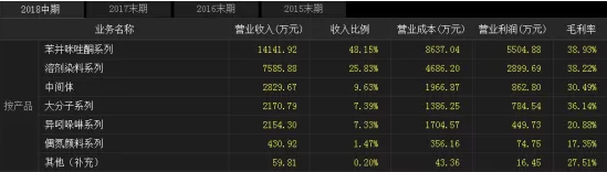 从业务构成方面来看,七彩化学的主要48.15%的收入来源于苯并咪咗酮系列产品,2018年上半年营业收入达14141.92万元;其次是溶剂染料系列、中间体、大分子系列、异吲哚啉系列、偶氮颜料系列产品。