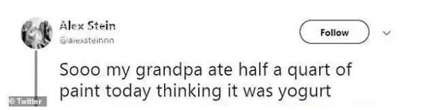 2月22日,美国纽约网友艾利克斯(Alex Stein)在社交媒体上发布了自己爷爷令人哭笑不得的行为:“额我的爷爷今天吃了将近500毫升油漆,他以为那是酸奶。”