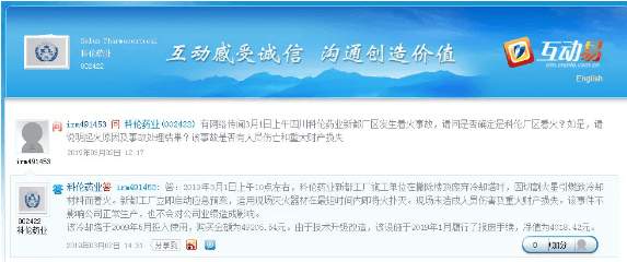 有网络传闻3月1日上午四川科伦药业新都厂区发生着火事故,科伦药业3月2日在深交所互动易上做出回应,称着火事故现场未造成人员伤害及重大财产损失,不影响公司正常生产,也不会对公司业绩造成影响。