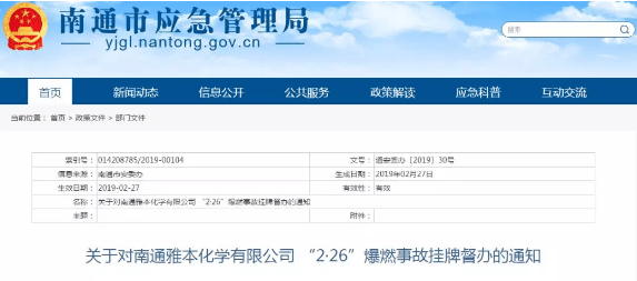 2月27日,南通市应急管理局也发布了:关于对南通雅本化学有限公司 “2·26”爆燃事故挂牌督办的通知