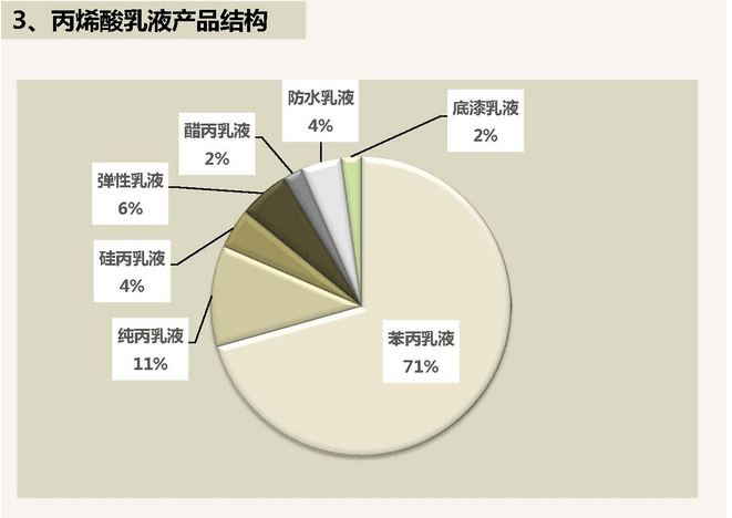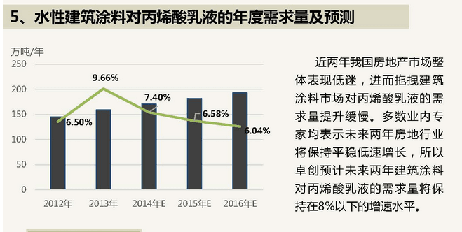 【中国涂料采购网】面对品种繁多的涂料市场,我们若对每种细分产品进行量化,进而推算出涂料对原材料的用量,那么将会对涂料及原材料市场相关业者提供一定的参考依据。我们以成膜物质丙烯酸乳液为例,通过实际调查及市场经验总结,以2013年为例,对水性建筑涂料市场对丙烯酸乳液的需求量进行细化探究。