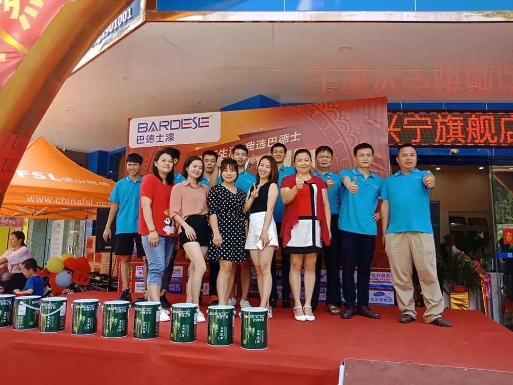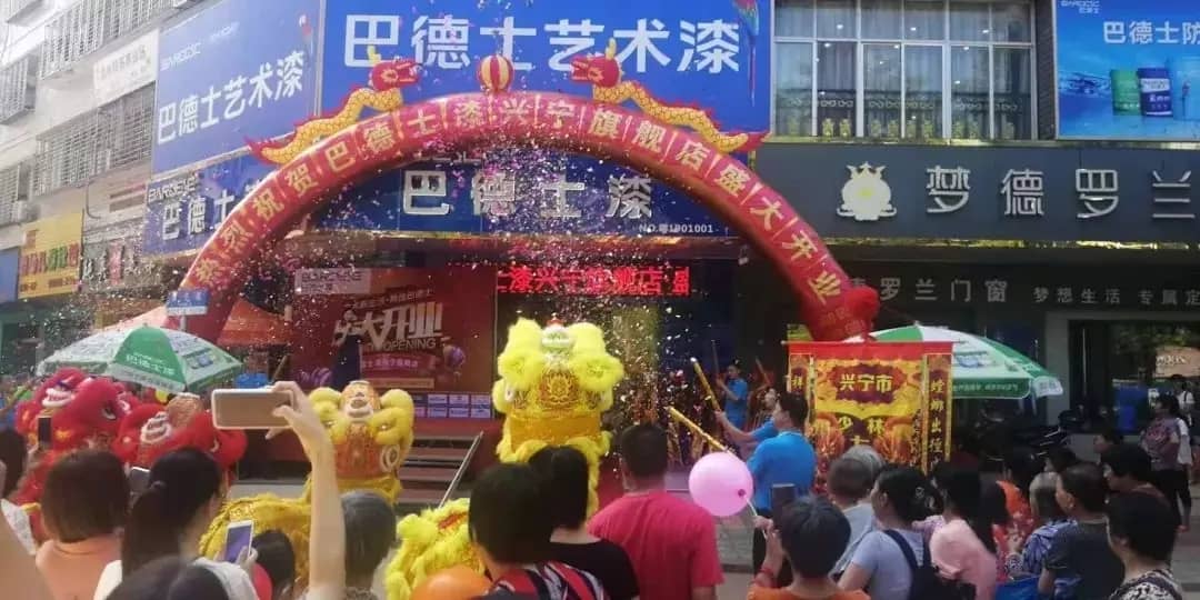 典礼现场彩旗飞舞,锣鼓喧天,凤舞龙蟠,四方宾客云集,巴德士集团全装饰涂料事业营销一部广东区李晓明部长等一行代表公司到场祝贺,与众宾客共聚一堂,为巴德士艺术漆入驻广东兴宁擂鼓助威!