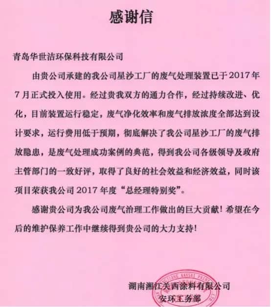 湘江关西涂料感谢信中称,自华世洁承建湘江关西涂料星沙工厂的废气处理装置投入使用以来,经过持续性改进、优化,目前该装置运营稳定,废气净化效率和废气排放浓度全部达到设计要求,运行费用低于预期,彻底解决了废气排放隐患,是废气处理成功案例的典范,得到了湘江关西各级领导及政府主管部门的一致好评,取得了良好的社会效益和经济效益。