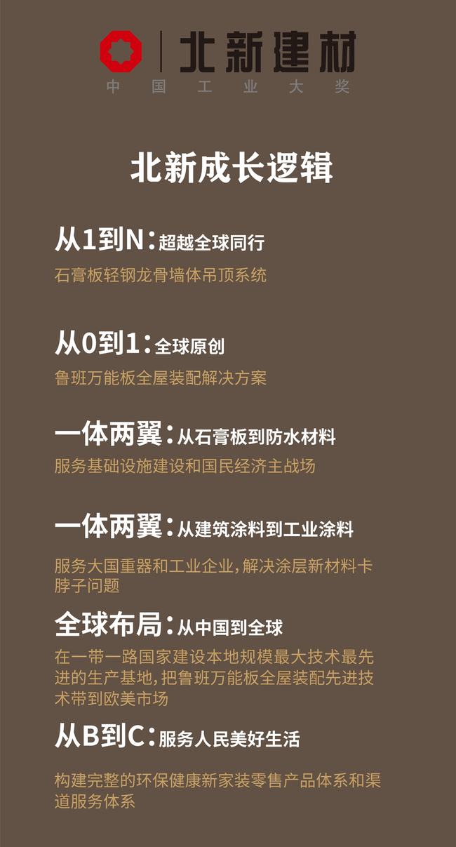北新建材坚持技术创新和品牌建设双战略引擎,打造核心竞争优势,带动企业高质量发展。通过国家技术创新示范企业复评,荣登中国企业专利实力500强143位,位居建材行业第一名。北新建材品牌价值815.59亿元再创新高,再次蝉联亚洲建材品牌三强,并蝉联行业“中国品牌年度大奖NO.1”。北新建材梳理确定六大成长曲线,通过六大成长曲线开启价值发现新征程。