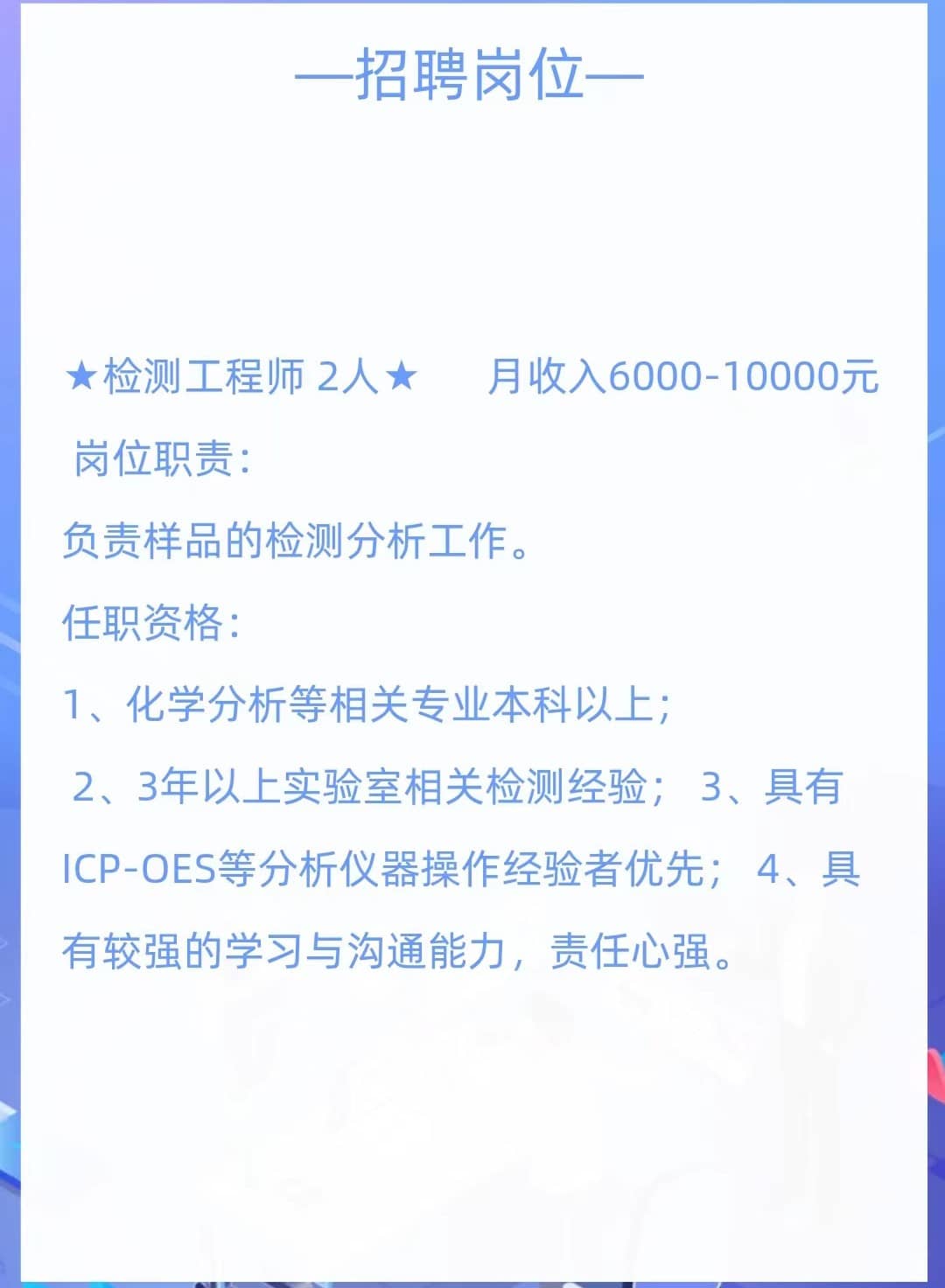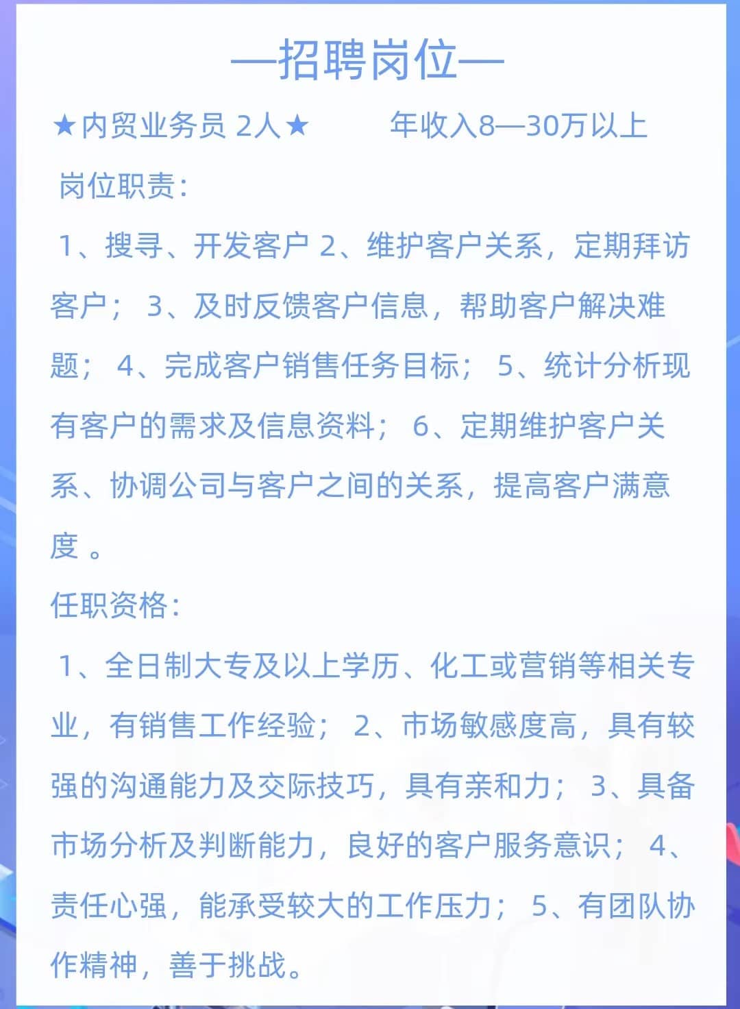 近日,江苏泛华化学科技有限公司发布招聘启事,招聘内贸业务员 2人、检测工程师 2人。