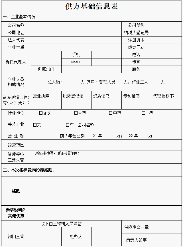 1、盖有企业公章的授权书、企业法人代表身份证明书、供方基础信息表、供应商信息汇总表,详见以下附件。