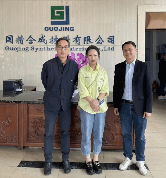 成都博高总经理麦朝忠(右)、销售总监周志伟(左)与涂料采购网市场部经理刘桐(中)合影