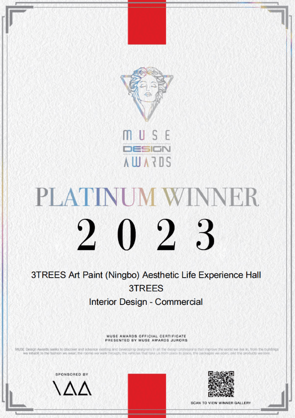 本次三棵树艺术涂料4.0店态获得MUSE设计奖中来自全球多个国家专业评审的高度认可和肯定,斩获设计类最高的铂金奖,充分显示了三棵树品牌在国际上的强大影响力。未来,三棵树将继续坚守“让家更健康,让城市更美丽,让生活更美好”的企业使命,研发更健康环保、更丰富多彩的艺术漆产品,提供更专业的一站式涂装服务,设计更有创意的艺术空间,满足人们对美好生活的追求。