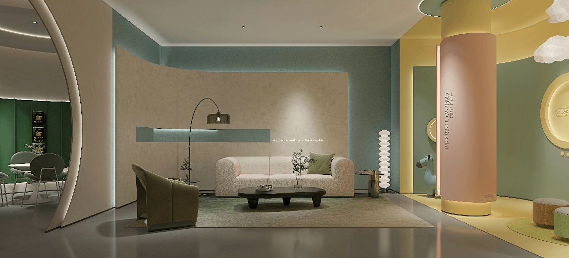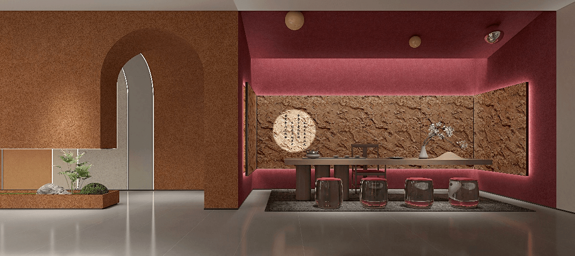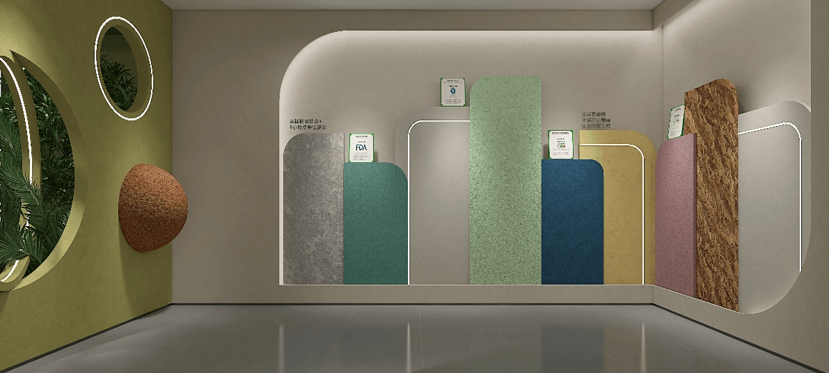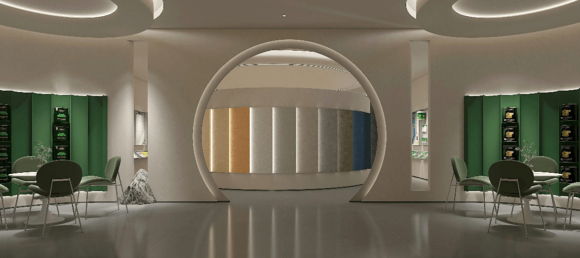 展厅整体空间设计的灵感来源于对三棵树企业文化的核心、老子的“道法自然”哲学的领悟,设计团队巧妙地运用了代表自然与包容的同心圆,利用同心圆在空间布局中灵活的运用,营造出灵动的空间布局及墙面展示,充分展现了三棵树艺术涂料的美及特性,赋予空间独特的艺术之美。