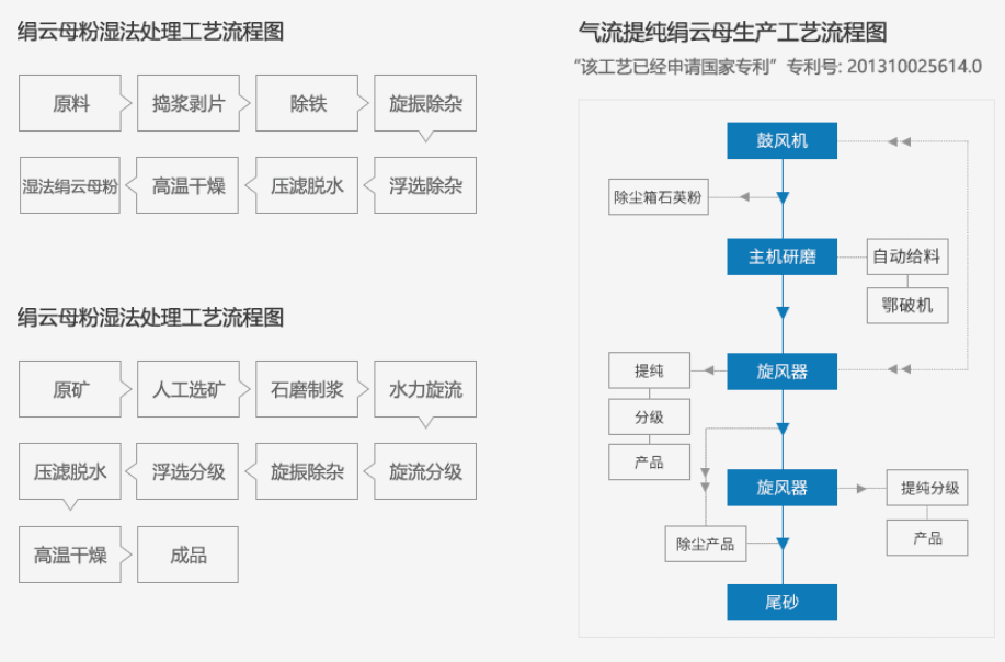 其次,依靠研发实力,我们拥有最先进的干湿法生产线,专利生产工艺。2011年就自主研发出了“绢云母专用气流提纯超细生产线”并在当年建成投产,该生产技术在2015年时获得“国家发明专利”。这项技术大大改善和提高了绢云母粉的纯度 ,也进一步提高了绢云母粉的各项性能。这项生产技术所采用的绢云母粉专用气流提纯生产线设有研磨系统、提纯系统、分级系统、除尘系统以及除铁系统和电控系统,充分考虑了绢云母粉生产中的若干重要环节,从而使设备的稳定性和产品的质量均能得到较好的保证。