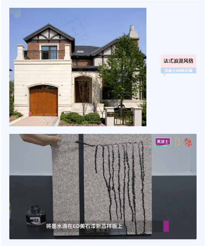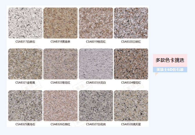 美涂士仿石漆使用绿色环保性水性涂料,硅丙乳液及助剂等优质原材料制作,使用纯水性配方,无毒无异味,低碳环保,减少有害气体释放,让家更安全,住得更健康。