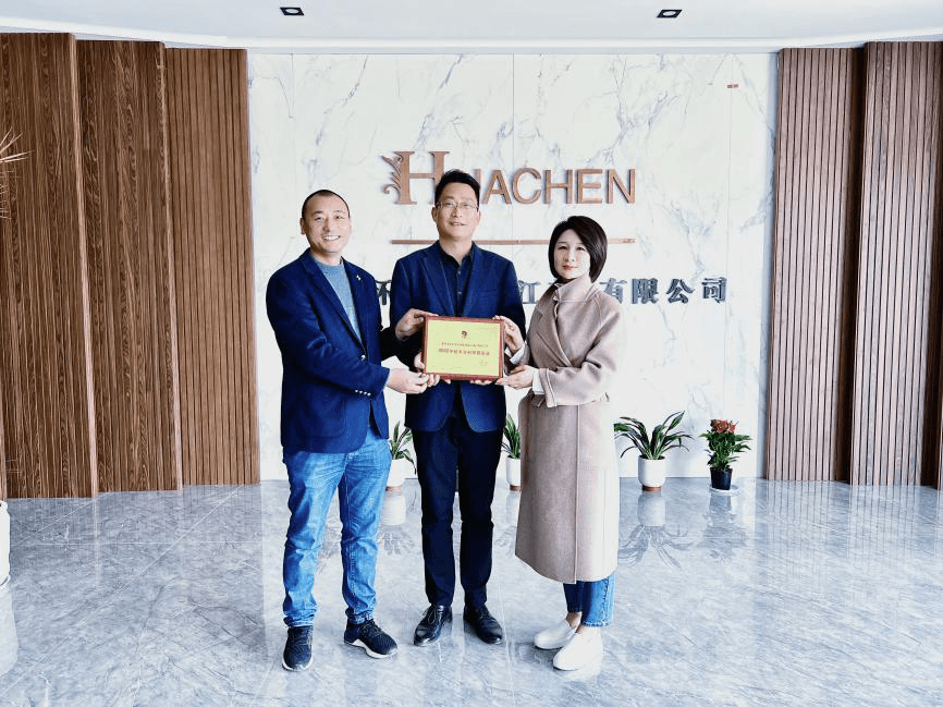 涂料采购网张馨元(右)为华辰环保科技董事长束利群(中)颁发奖牌
