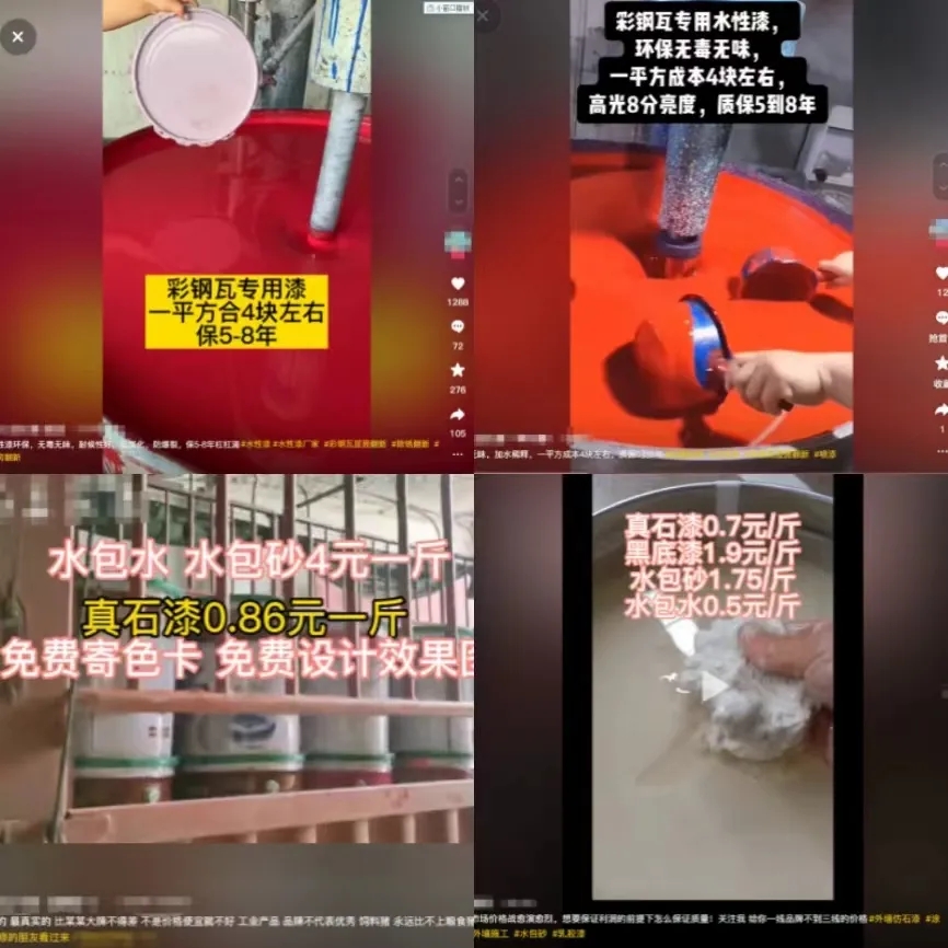 此外还有1元/公斤的工程漆、一平方米成本4元的水性工业漆、包工包料8元/平米的彩钢瓦漆、以及8毛钱左右的真石漆、5元/公斤的钢结构水漆,号称质保8年,但这背后却是起泡褪色,只起到了装饰作用,却没有为工件起到保护作用。
