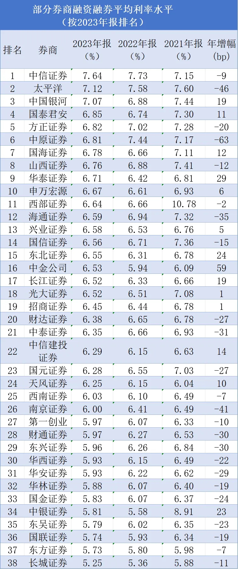 券商打响新一轮佣金价格战,目前市面上多家券商融资年利率可做到5%以下,还有券商给出“500万元资金即可给到4%”的超优惠费率。目前的实际操作中,最大折扣已低于公示利率的五折。对2021年至2023年间有可比数据的38家上市券商融资融券利率进行统计发现,两融利率已处于长期下降通道。
