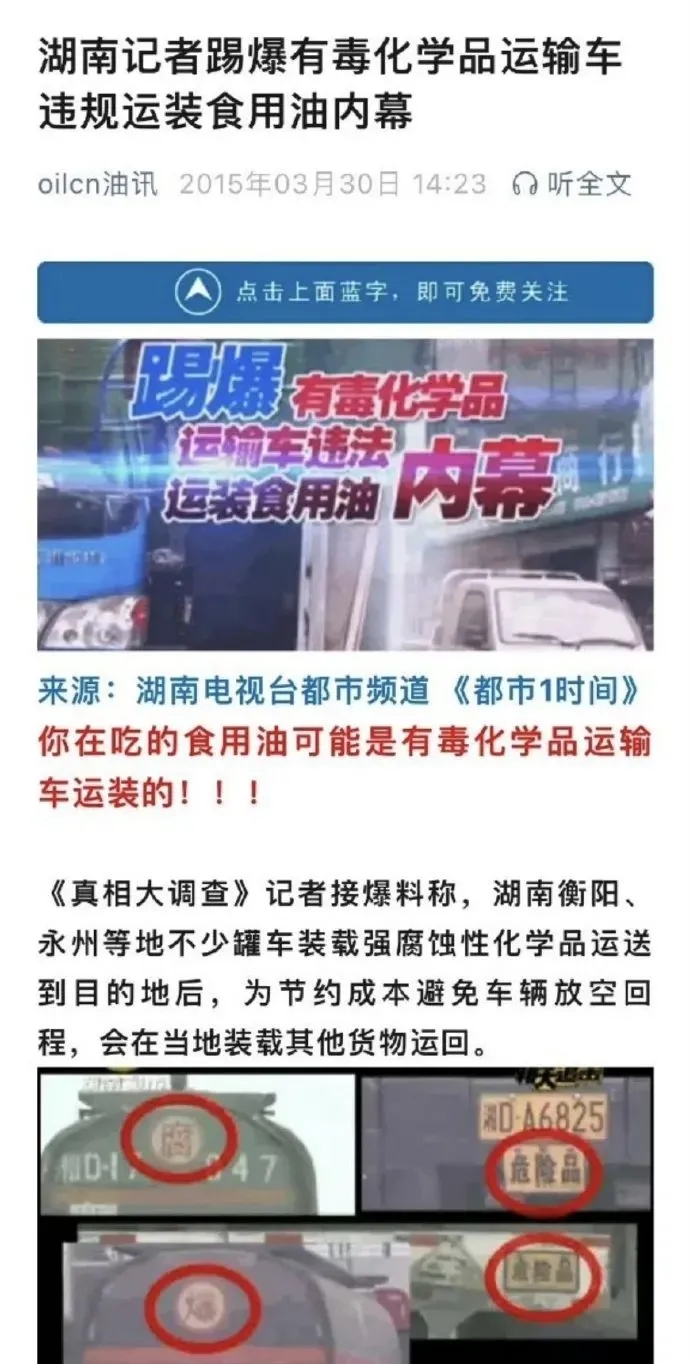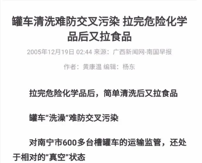 早在2005年,一篇标题为“罐车清洗难防交叉污染,拉完危险化学品后又拉食品”的新闻报道就揭露了黑暗一幕——油罐车拉完油后又拉食品,还曝光了广西的600多辆罐车处于监督“真空”状态。