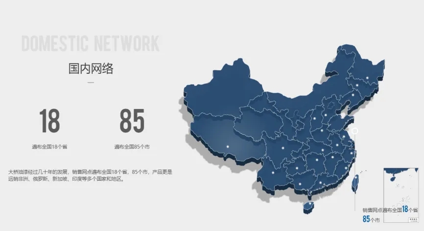 作为一家专注于涂料领域60余年的传统工业防护涂料制造企业,大桥油漆积极响应国家政策,产品研发也日趋偏向于更贴合市场需求和行业趋势的水性涂料产品,产品已涵盖水性醇酸、水性丙烯酸、水性环氧、水性聚氨酯、水性铝粉漆和水性石墨烯船用漆等系列,分别应用于钢结构防腐、高端装备制造、工程机械设备、汽车零部件、油桶电机、船舶等多个领域,广受用户好评。销售网点遍布全国18个省,85个市,产品更是远销非洲、俄罗斯、新加坡、印度等多个国家和地区。