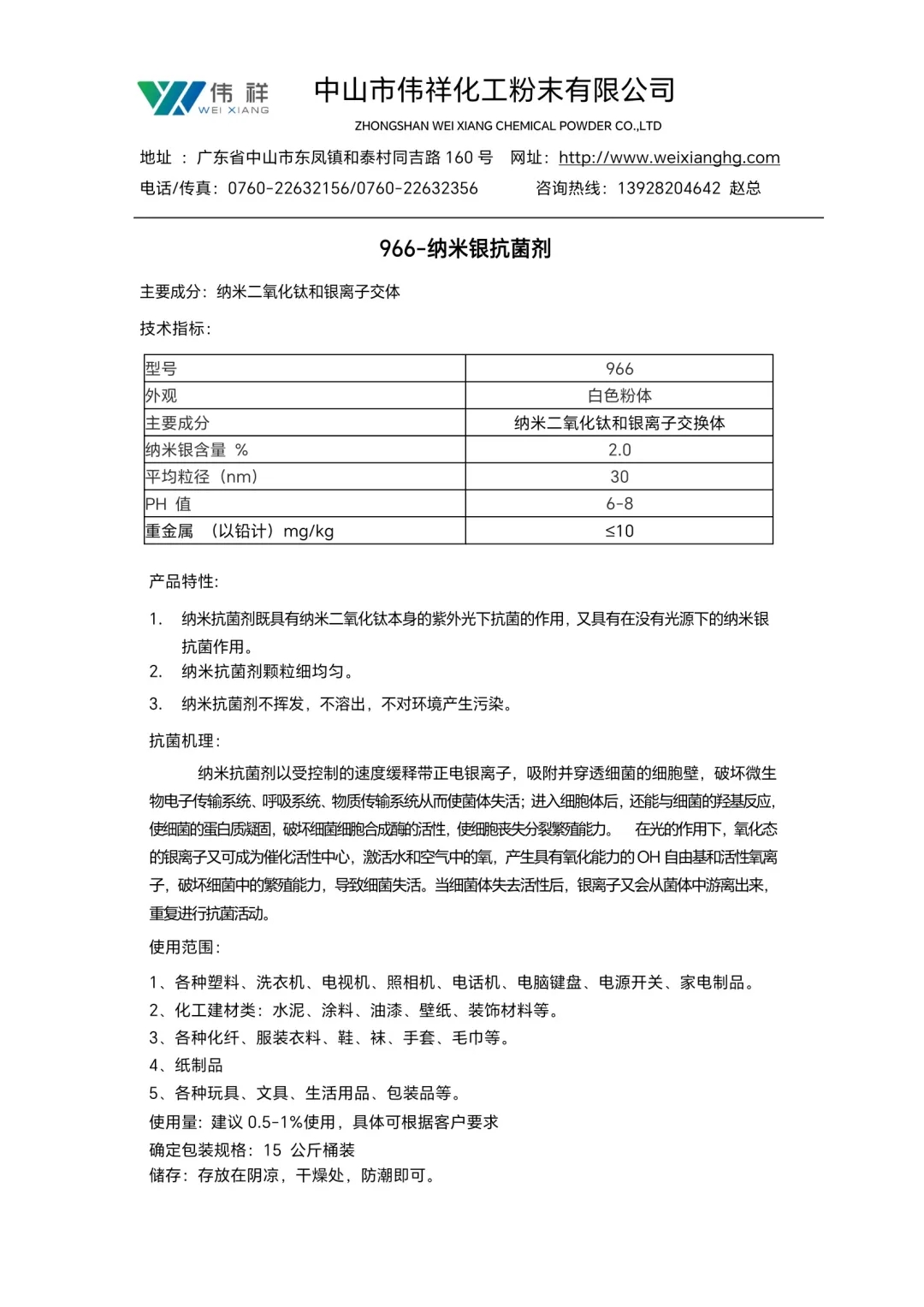 随着国家对于环境保护和可持续发展的重视程度日益提升,中山伟祥966纳米银抗菌剂应势而生。其具有在紫外光下的抗菌作用,没有光源时纳米银同样具有抗菌作用,并且产品颗粒均匀,不挥发,不容出,不对环境产生污染。可以应用于化工、建材、家居、包装等下游企业的生产发展中,从而减少在生产过程中对环境的影响。