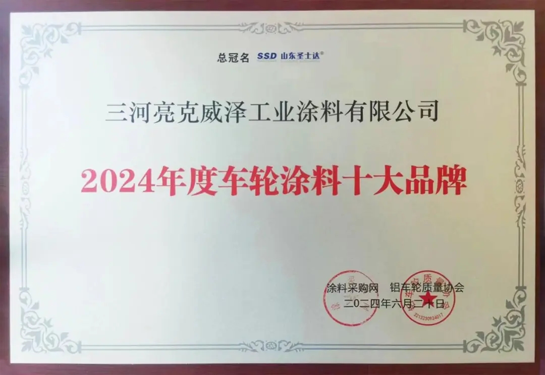 有限公司(以下称亮克威泽)其卓越的产品性能和市场表现,在一众企业中脱颖而出,荣获“2024年度车轮涂料十大品牌”称号,王孝东秘书长与刁鹏方副总对于亮克威泽的入选表示热烈的祝贺,并希望亮克威泽在今后的发展过程中,能够研发生产出车轮涂料所需要的轮毂涂料,共同推动铝车轮行业的高质量发展。