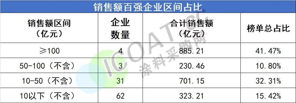 从销售额情况来看,2023年涂料百强企业合计销售额达到2140.03亿元,同比2022年数据增长了123.56亿,增幅约6.13%。其中销售额在100亿元以上、50亿元-100亿元(不含)的企业共有7家,合计销售额占百强总销售额的52%。10亿元-50亿元(不含)、1.78亿元-10亿元(不含)的企业共93家,占比为32.31%和15.42%。