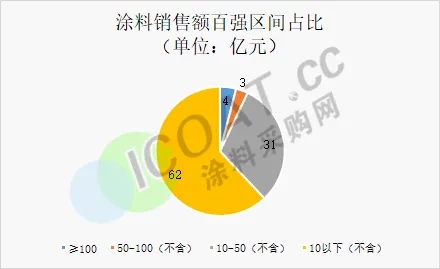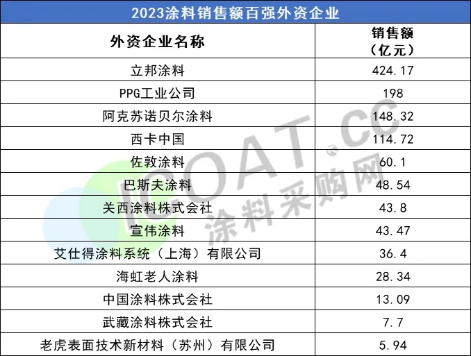 在销售额百强中,共有十几家外资涂料企业上榜,合计销售额为1172.59亿元,占TOP100涂料企业总产量的55%左右。这也揭露出一个趋势:尽管新上榜的6家企业均为本土企业,显示出民族品牌的活力和潜力,但榜单上仍有十几家外资涂料企业占据一席之地,民族涂料企业在榜单上的占比不足50%,反映出民族企业在与外资企业的竞争中仍面临着一定的挑战。