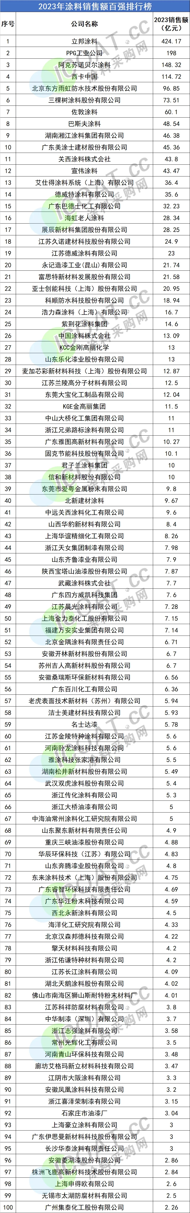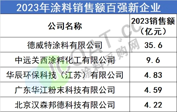 在审视2023年的涂料销售额百强榜单时,我们注意到有5家新晋企业崭露头角,它们分别是德威特涂料有限公司、中远关西涂料化工有限公司、华辰环保科技(江苏)有限公司、广东华江粉末科技有限公司,以及北京汉森邦德科技有限公司。这些企业的销售额介于4.22亿元至35.6亿元之间,占销售额百强总数据的2.7%左右,并且大多数为本土企业。