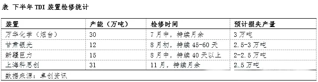 正所谓龙头吼一吼,行业抖三抖,“化工一哥”的停车检修,在行业内引起极大的重视。值得注意的是,下半年国内TDI、MDI装置检修计划较多,产量有损失风险,供应或持续偏紧,预计三季度行业产量将大幅萎缩。而供给紧缺后续会不会出现价格上涨,恐怕无人能够断言。