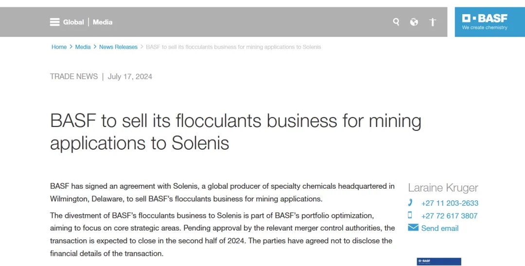 巴斯夫宣布,将用于采矿的絮凝剂业务出售给美国特种化学品生产商索理思。而在1个月以前,巴斯夫宣布已将其位于美国圣地亚哥的Spartec®生物能源酶业务出售给拉曼集团的子公司Danstar Ferment AG和Lallemand Specialties Inc。