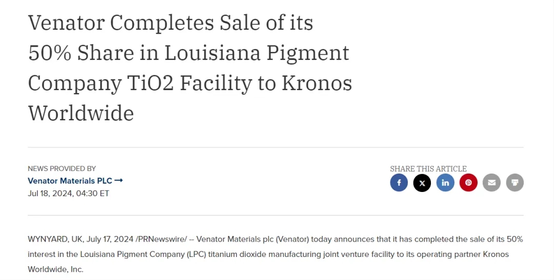 泛能拓将持有的路易斯安那颜料公司二氧化钛制造合资企业工厂50%的股份转让给康诺斯。