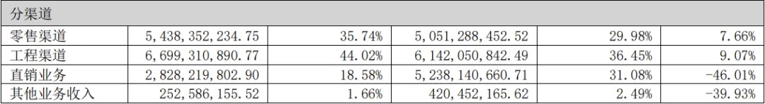 按渠道销售来看,零售渠道营收54.384亿元,同比增长7.66%;工程渠道营收66.993亿元,同比增长9.07%;直销业务营收28.282亿元,同比下降46.01%;其他业务收入2.526亿元,同比下降39.93%。