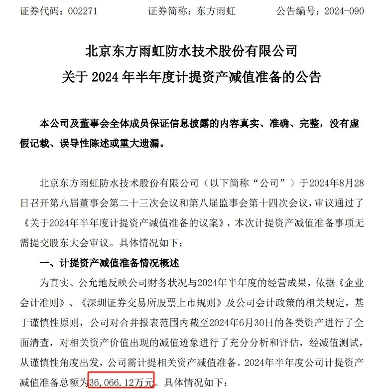 在财报发布的同时,东方雨虹还发布了《关于2024年半年度计提资产减值准备的公告》,称基于谨慎性原则,2024年半年度公司计提资产减值准备总额约为3.61亿元,相应减少2024年半年度合并报表归属于上市公司股东的净利润约3.61亿元。