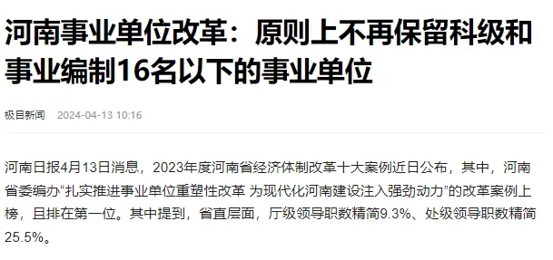 事实上,近几年国家多次提出缩减公务人员编制的相关要求,政府机构这两年也在逐渐完成改革重组工作。此前,中国户籍人口第一大省——河南也传出消息,省直事业机构按不低于50%精简,编制精简不低于30%,科级和事业编制16名以下的事业单位直接撤销。最终结果是,连厅级领导职数都精简了9.3%,处级领导职数直接砍掉了25.5%。