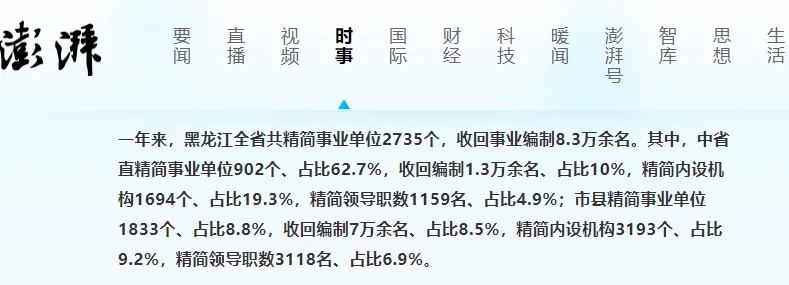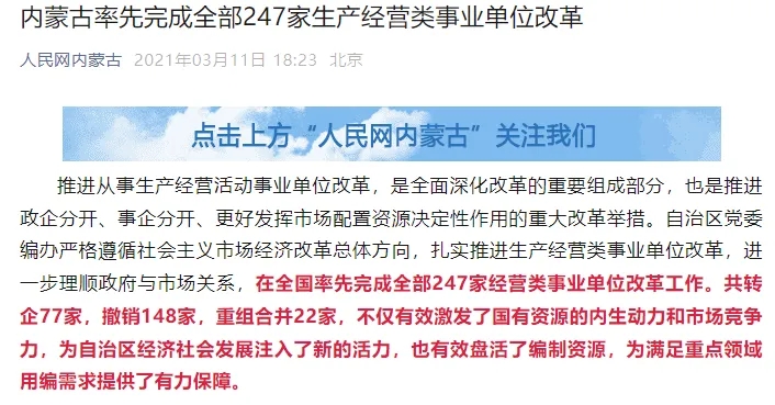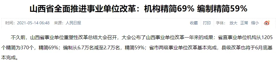 除了河南之外,另外几个全国深化事业单位改革全域试点也陆续曝出动作。黑龙江早已完成改革,精简事业单位2735个,收回事业编制8.3万余名。内蒙古完成自治区247个经营类事业单位改革,区本级精简收回3000余名事业编制。山西事业单位编制从6.7万名减至2.7万名,精简4万,有900多家经营性事业单位转企改制。