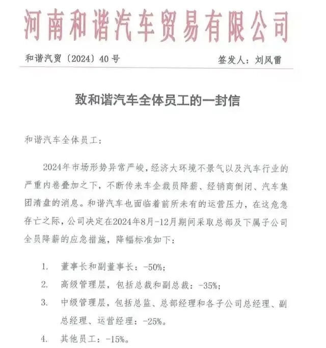 国内豪华汽车品牌经销商和谐汽车被曝全员降薪,据网传《一封信》显示,和谐汽车决定在2024年8月-12月期间采取总部及下属子公司全员降薪的应急措施。其中,董事长和副董事长降薪50%。和谐汽车回应称,“全员降薪是我们主动适应市场大环境的阶段性举措。”