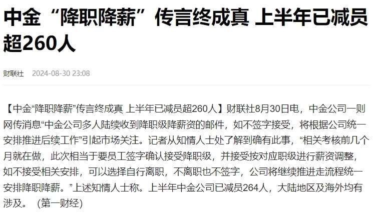 中金公司一则网传消息“中金公司多人陆续收到降职级降薪资的邮件,如不签字接受,将根据公司统一安排推进后续工作”引起市场关注。记者从知情人士处了解到确有此事,上述知情人士称。上半年中金公司已减员264人,大陆地区及海外均有涉及。