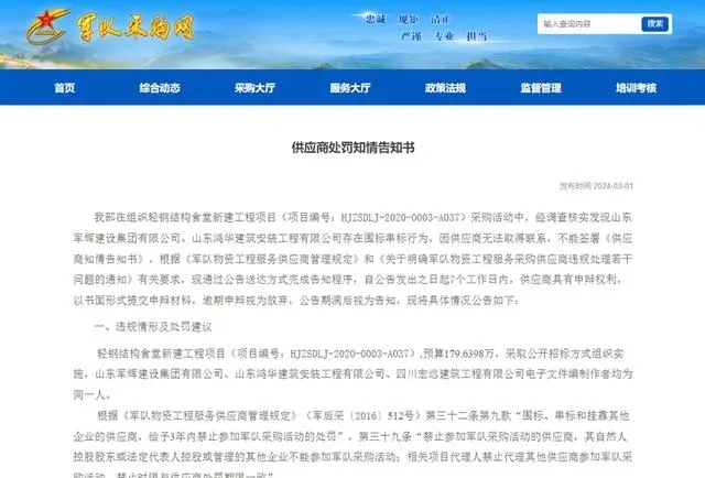 军采网发布《供应商处罚知情告知书》显示,山东军辉建设集团有限公司、山东鸿华建筑安装工程有限公司因存在围标串标行为被处罚。山东军辉建设为石油化工、机电安装总承包一级企业,近年来因违规问题多次被罚。