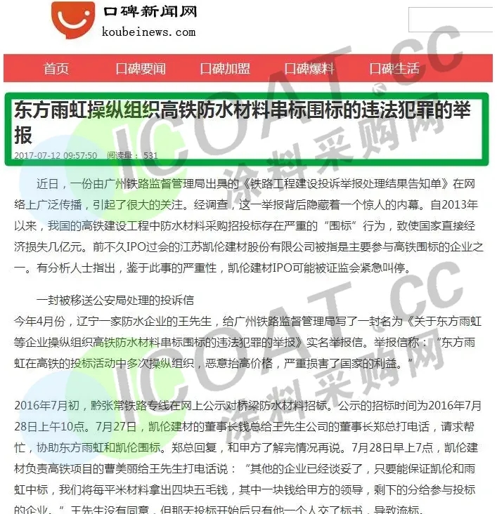 辽宁某防水企业的王先生实名举报,东方雨虹在高铁的投标活动中多次操纵组织,恶意抬高价格,严重损害了国家的利益。东方雨虹负责高铁项目的人员组织会议,要求其他厂家的投标价格高于雨虹和凯伦。并表示只要能保证凯伦和雨虹中标,将每平米材料拿出四块五毛钱,其中一块钱给甲方的领导,剩下的分给参与投标的企业。