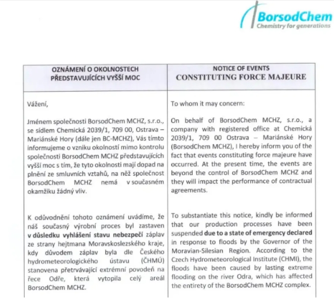 宝思德(捷克)公司正式发布不可抗力公告,其中MDI原料苯胺装置受影响,工厂停车。而位于匈牙利工厂的MDI装置受原料供应问题,低负荷运行,涉及产能40万吨,直接导致万华10月或紧急提升对欧洲的调货,本月停止接单。