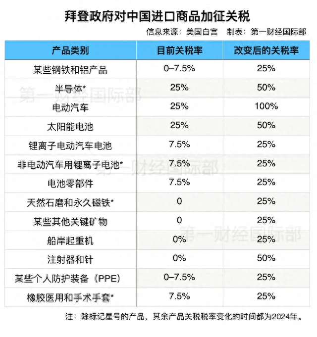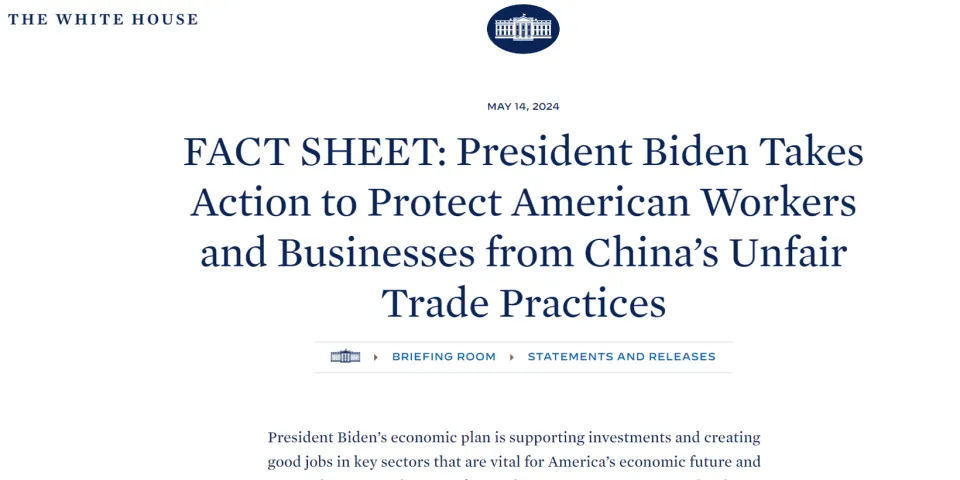 5月16日,美国宣布对华加征301关税四年期复审结果,在原有对华301关税基础上,进一步提高对自华进口的电动汽车、锂电池、光伏电池、关键矿产、半导体以及钢铝、港口起重机、个人防护装备等产品的加征关税。其中,对进口的中国电动汽车征收4倍关税,从25%提高到100%,中国太阳能电池的进口税也将翻一番,从25%提高到50%。从2025年开始,美国进口中国半导体的关税将从25%跃升至50%。