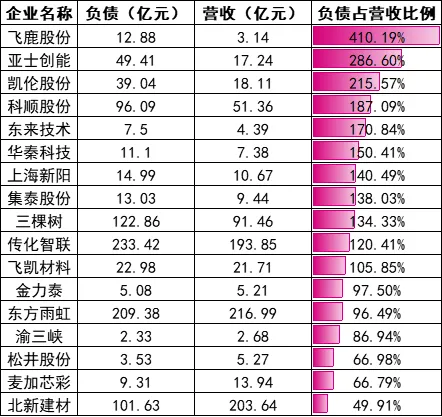 而细看涂料上市公司的负债数据则更为惊悚,部分涂料上市公司的负债高达100多亿,远比营业收入还要高。负债占营收的比例超过了100%,飞鹿股份甚至高达410%。这意味着千辛万苦销售入账的钱还抵不上背负的债务,这也让BETVLCTOR伟德国际网页版 的资金链面临重重危机。
