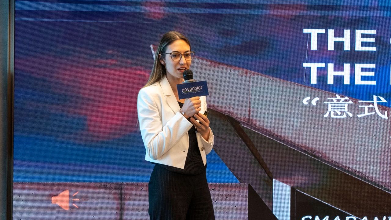 Novacolor亚太区负责人Valentina女士带来了2025年度流行色——“Ecilipsia 日食橙”,并逐一展示了SIGNATURE COLLECTION 2025系列作品。