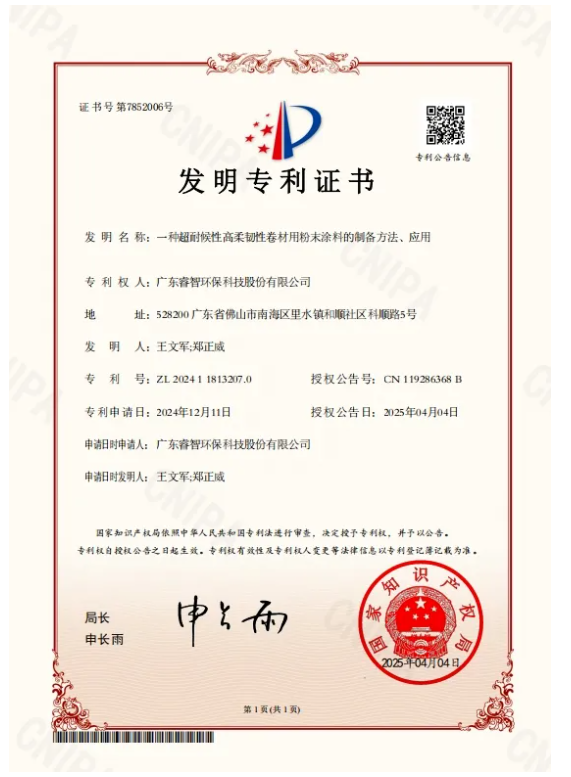 近日,国家知识产权局发布《一种超耐候性高柔韧性卷材用伟德客户端官网的制备方法、应用》发明专利证书,该证书的获得则是广东睿智环保科技股份有限公司,该产品的发明人是王文军、郑正威。