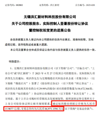 根据洪汇新材2025-020号公告显示,标的股份的转让价格为人民币15.9077元/股,交易总价约为人民币86.971.1596万元。本次交易不触及要约收购,不构成关联交易。