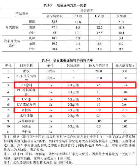根据上表,项目理论计算溶剂漆、水性漆与企业提供的资料接近,本环评以 企业提供的涂料用量进行计算,即UV漆35t/a,PU漆55t/a,水性漆100t/a。