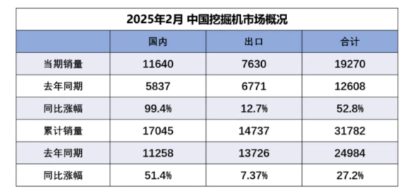 阳春三月,工程机械行业的热度堪比历年的“金九银十”。2025年2月,销售各类挖掘机19270台,同增52.8%。其中国内销量11640台,同增99.4%;出口量7630台,同增12.7%。