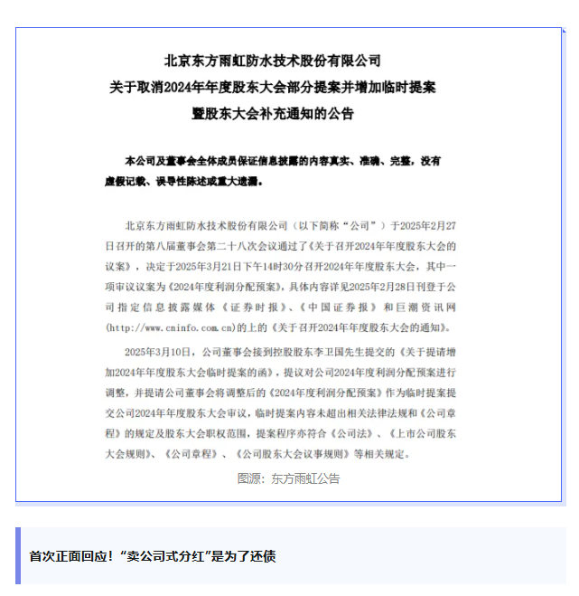 而对于2024年度利润分配预案调整一事,东方雨虹则回应道,将2024年年度分红调整为分次分红,这一决策更具备稳定性、持续性、可预期性和可实施性,能够更好地强化资金储备,使公司保持更加充裕的流动性,提升抗风险能力,提升公司偿债能力,增强应对风险的缓冲能力。公司拟将原2024年年度利润分配预案调整为分次分红,以达到年内多次分红、分期实施的目的。
