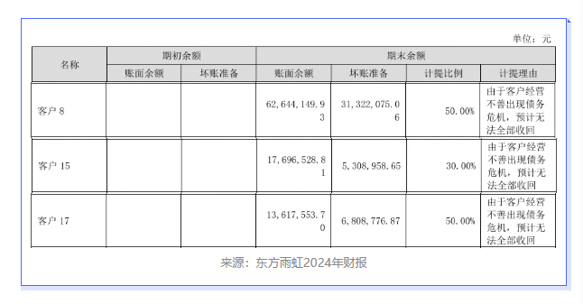 东方雨虹回应,本公司对该应收款项单项计提坏账准备,除单项计提坏账准备的应收款项之外,本公司依据信用风险特征对应收款项划分组合,在组合基础上计算坏账准备,客户8、客户15、客户17应收账款在2023年存在余额,2023年披露在组合计提坏账中,2024年度公司结合客户的信用风险判断披露在单项计提坏账准备客户中。